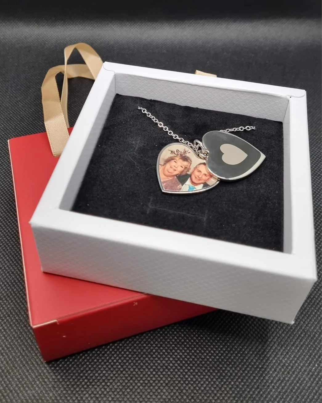 The heart pendant necklace has been very popular. Made using high quality metal the front heart slides aside to show the image beneath. The chain is strong and 18.5 inches (47 cm) long with closing mechanism. The printable area is approximately 3cm x 3.3cm.